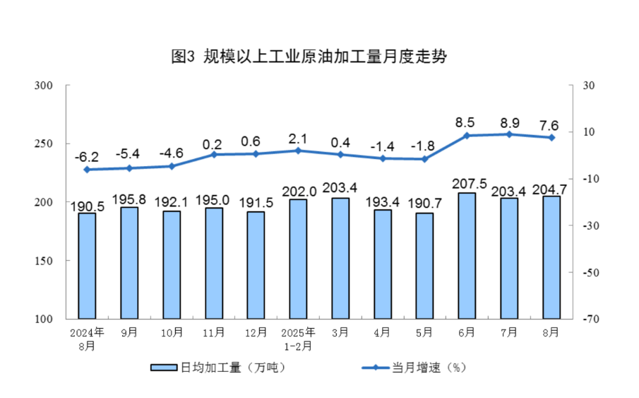 原油加工较快增长。8月份,规上工业原油加工量6346万吨,同比增长7.6%;日均加工204.7万吨。