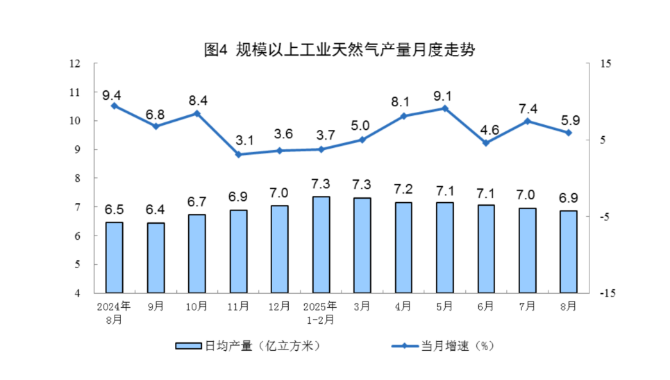 天然气生产稳定增长。8月份,规上工业天然气产量212亿立方米,同比增长5.9%;日均产量6.9亿立方米。
