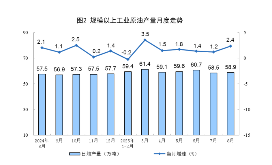 原油生产增速加快。8月份,规上工业原油产量1826万吨,同比增长2.4%,增速比7月份加快1.2个百分点;日均产量58.9万吨。
